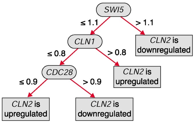 结果解读显示,两种策略均能构建有效分类器,其中结合包装器特征选择的C4.5算法在酵母细胞周期数据集中表现更稳定,例如CLB1基因的同时性预测分类器在10倍交叉验证中准确率为95.8%(n=30,P<0.001),在cdc28与alpha-factor测试集中准确率分别为88.2%(n=17,P<0.01)与88.9%(n=18,P<0.01),说明分类器具有良好的泛化能力。文中展示的CLN2基因决策树(图1)直观呈现了SWI5、CLN1、CDC28对CLN2的调控阈值,验证了分类器的可解释性。