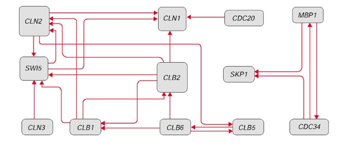 结果解读显示,共提取多组高准确性调控规则,例如CLB1与CLB2的同时性调控规则“±CLB2⇔±CLB1”,与已知的G2期CLB1/CLB2共表达的生物学知识一致;CLB2与CLN2的负向调控规则“-CLB2⇔+CLN2”,对应G2/M期向G1期转换的调控开关特征。构建的基因调控网络(图2)包含两个独立模块,分别对应G1期与G2/M期的基因调控关系,与酵母细胞周期的阶段特异性调控特征相符。