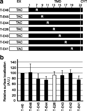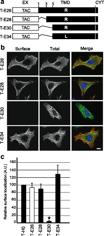 结果解读:如图2所示,含Env TMD的嵌合蛋白(T-E14、T-E15、T-E26)均能高效定位于细胞表面,其中T-E14因胞质域的内吞基序导致部分蛋白位于细胞内,但T-E15(缺失胞质域)几乎完全定位于细胞表面,定量结果显示T-E14的表面定位比例显著低于T-H0(n=4,P<0.01),但仍维持较高水平,证实Env TMD不会引发内质网滞留,且这一特性与胞质域或胞外近膜域无关。