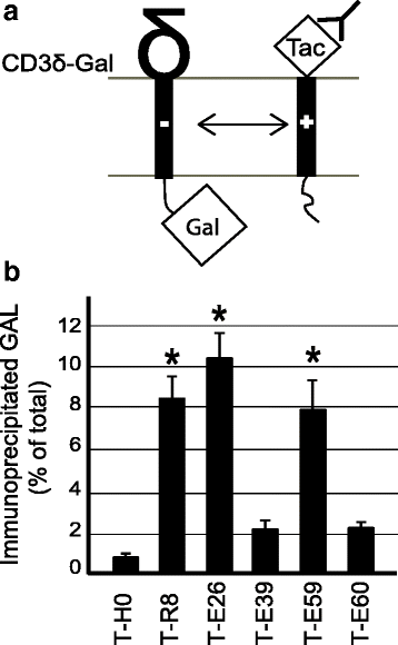 方法细节:共表达Tac嵌合蛋白与含天冬氨酸残基的TCR δ亚基-β半乳糖苷酶融合蛋白,免疫沉淀Tac蛋白后检测共沉淀的β半乳糖苷酶活性,评估相互作用强度。