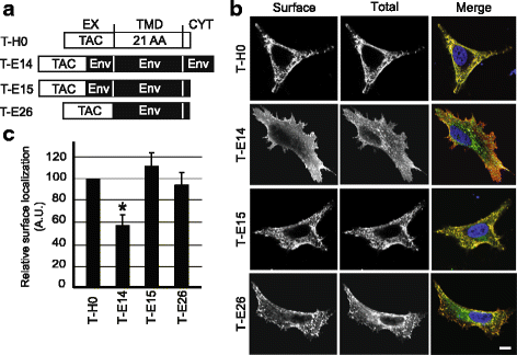 方法细节:构建Tac抗原与不同Env TMD片段的嵌合蛋白(包括含胞质域、仅TMD等不同形式),转染HeLa细胞后,通过免疫荧光染色分别标记细胞表面与总蛋白,共聚焦显微镜观察定位并定量分析表面蛋白比例。