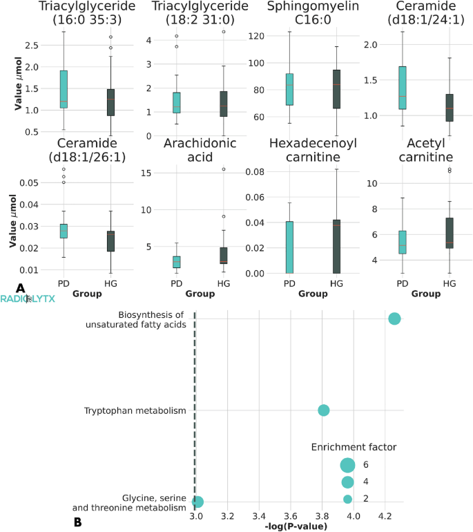 研究过程详述:这些生物标志物来源于空腹血浆样本,采用液相色谱-串联质谱(LC-MS/MS)和流动注射串联质谱(FIA-MS/MS)进行定量检测;特异性与敏感性数据显示,基于33种代谢物构建的OPLS模型ROC曲线AUC为0.97(95%置信区间0.972-1.0),样本量n=78(39名帕金森病患者、39名健康对照),具有极佳的疾病区分能力。