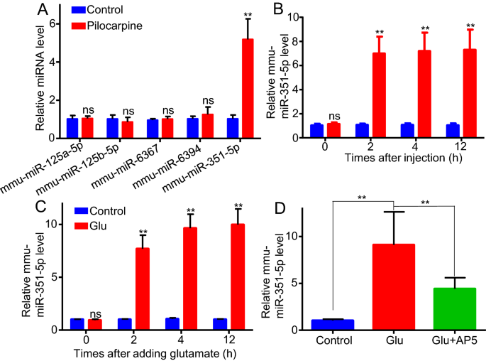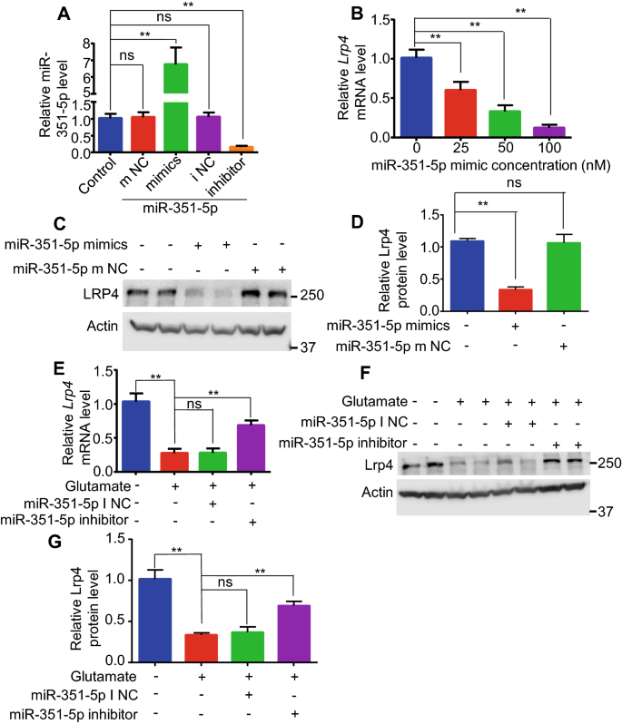 实验目的:明确miR-351-5p是否为谷氨酸下调Lrp4的关键调控分子。方法细节:通过TargetScan网站预测靶向Lrp4的miRNA,体内检测匹罗卡品处理后海马组织中候选miRNA的表达,体外检测谷氨酸处理后星形胶质细胞中miR-351-5p的水平;将miR-351-5p模拟物(50nM)或抑制剂(50nM)转染至星形胶质细胞,检测Lrp4的表达变化;同时检测AP5对谷氨酸诱导miR-351-5p升高的影响。结果解读:体内实验显示,匹罗卡品处理后2小时,海马组织中miR-351-5p水平升高约6倍,且持续至12小时(n=3,P<0.01);体外实验显示,谷氨酸处理后2小时,星形胶质细胞中miR-351-5p水平升高约7倍(n=3,P<0.01),AP5可部分抑制该升高;转染miR-351-5p模拟物后,Lrp4 mRNA水平下降约70%(50nM,n=3,P<0.01),蛋白水平显著降低;转染miR-351-5p抑制剂后,谷氨酸诱导的Lrp4下调被显著逆转,12小时mRNA仅下降约25%(n=3,P<0.01)。这些结果表明miR-351-5p介导了谷氨酸对Lrp4的下调作用。