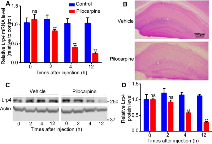 实验目的:验证癫痫发作是否会影响小鼠海马组织中Lrp4的表达水平。方法细节:采用匹罗卡品诱导小鼠癫痫发作模型,在注射后0、2、4、12小时分别处死小鼠(n=3/组),取海马组织,通过实时荧光定量PCR(qRT-PCR)检测Lrp4的mRNA水平,利用Lrp4-lacZ/+杂合子小鼠进行X-半乳糖苷酶染色观察Lrp4的活性分布,通过蛋白质免疫印迹(Western blot)检测Lrp4的蛋白水平。结果解读:qRT-PCR结果显示,与对照组相比,匹罗卡品处理后2小时Lrp4 mRNA水平开始显著下降,且下降趋势持续至12小时(n=3,P<0.01);X-半乳糖苷酶染色结果显示,海马腔隙分子层(LMol)和分子层(Mol)(主要为星形胶质细胞分布区域)的Lrp4活性显著降低;Western blot结果显示,Lrp4蛋白水平在4小时开始显著下降,晚于mRNA的变化时间(n=3,P<0.01)。这些结果表明癫痫发作可在体内显著下调海马组织中Lrp4的表达(包括mRNA和蛋白水平)。