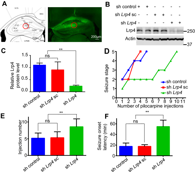 实验目的:验证海马组织中Lrp4下调是否可提高小鼠的癫痫发作阈值。方法细节:通过立体定向注射shLrp4慢病毒至小鼠海马LMol和Mol层,2周后检测海马组织中Lrp4的蛋白水平以验证敲低效率;随后用匹罗卡品(初始200mg/kg,后续每30分钟注射100mg/kg)或戊四氮(PTZ)诱导癫痫发作,观察小鼠的发作评分及全面性惊厥发作潜伏期。结果解读:Western blot结果显示,shLrp4慢病毒注射后,海马组织中Lrp4蛋白水平下降约70%(n=3,P<0.01);匹罗卡品处理后,对照组小鼠在第5次注射后达到5级发作(剧烈抽搐、倒地、死亡),而shLrp4组小鼠在第9次注射后仍未达到5级发作(n=10,P<0.01);PTZ处理后,shLrp4组小鼠的全面性惊厥发作潜伏期显著长于对照组(n=10,P<0.01)。这些结果表明海马组织中Lrp4下调可显著提高小鼠的癫痫发作阈值。