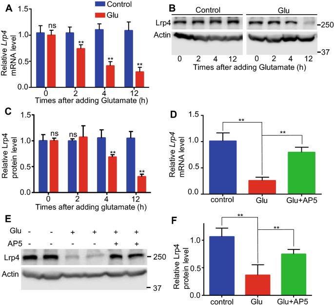 实验目的:模拟癫痫发作时谷氨酸过度释放的状态,明确其对星形胶质细胞Lrp4表达的调控及信号通路。方法细节:原代培养小鼠海马星形胶质细胞,用0.5mM谷氨酸处理0、2、4、12小时,检测Lrp4的mRNA和蛋白水平;同时设置谷氨酸联合NMDA受体拮抗剂AP5(50mM)处理组,观察AP5对谷氨酸调控Lrp4的影响。结果解读:谷氨酸处理后2小时,Lrp4 mRNA水平下降约30%,12小时下降约60%(n=3,P<0.01);蛋白水平在4小时下降约30%,12小时下降约50%(n=3,P<0.01);联合AP5处理后,12小时Lrp4 mRNA仅下降约20%,蛋白下降约25%,显著低于单独谷氨酸处理组(n=3,P<0.01)。这表明谷氨酸通过激活星形胶质细胞NMDA受体下调Lrp4的表达。