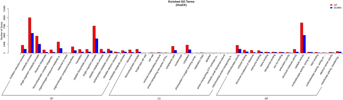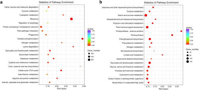 实验目的:解析差异表达基因参与的生物学过程与代谢通路,明确太行菊干旱响应的核心分子通路。方法细节:选取对照组与重度胁迫组间的DEGs进行GO(基因本体)和KEGG(京都基因与基因组百科全书)富集分析,GO富集使用GOseq R包基于非中心超几何分布计算,KEGG富集基于KEGG数据库的基因注释信息。结果解读:GO富集显示,DEGs主要富集在“代谢过程”“催化活性”“单生物过程”等功能条目,且上调基因数量显著多于下调基因(图4);KEGG富集显示,上调DEGs主要富集在氨基酸代谢通路,包括半胱氨酸和甲硫氨酸代谢、精氨酸和脯氨酸代谢等,下调DEGs主要富集在淀粉和蔗糖代谢通路(图5),表明太行菊通过增强氨基酸代谢(尤其是脯氨酸合成相关通路)调节细胞渗透压,同时下调碳水化合物代谢以减少能量消耗,从而适应干旱胁迫。