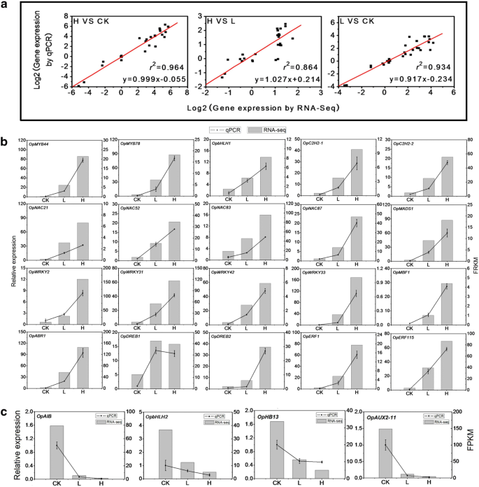 实验目的:验证转录组测序结果的可靠性,确认核心干旱响应基因的表达模式。方法细节:选取32个差异表达的核心基因(包括MYB、bHLH、C2H2等家族成员),使用Primer 5软件设计特异性引物,采用Roche的LightCycler 480实时荧光定量PCR系统进行qRT-PCR检测,每个样本设置3个生物学重复,采用2^-△△CT法计算相对表达量。结果解读:qRT-PCR结果与转录组数据的相关性系数在对照组vs重度胁迫组、重度胁迫组vs轻度胁迫组、轻度胁迫组vs对照组分别为0.964、0.864、0.934(图7a),表明转录组数据具有较高的可靠性;多数转录因子(如OpMYB44、OpbHLH1)随胁迫程度增加显著上调,少数基因(如OpDREB1)在重度胁迫下略有下调(图7b、c),进一步验证了转录组分析的结果。