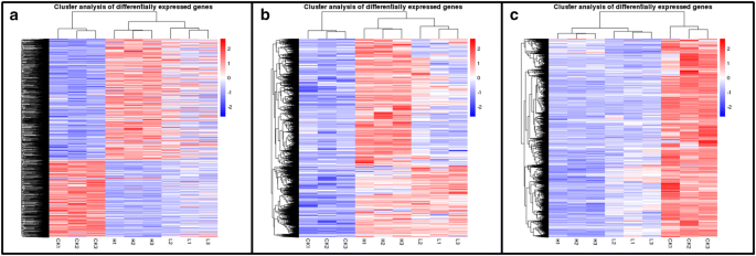 实验目的:鉴定太行菊响应不同程度干旱胁迫的差异表达基因(DEGs),明确分子层面的响应特征。方法细节:提取对照组、轻度胁迫组、重度胁迫组叶片的总RNA,构建RNA-seq文库后采用Illumina HiSeq 2500平台测序,以拟南芥基因组为参考序列进行比对,使用DESeq R包进行差异表达分析,筛选阈值为|log2(倍数变化)|>1且校正后P值<0.005。结果解读:对照组与轻度胁迫组间共鉴定出23056个DEGs,其中12180个上调、10876个下调;轻度胁迫组与重度胁迫组间共鉴定出8032个DEGs,其中6182个上调、1850个下调;对照组与重度胁迫组间共鉴定出43074个DEGs,其中26977个上调、16097个下调(图2);层次聚类分析显示,差异基因的表达水平随胁迫程度加剧呈现显著的梯度变化,上调与下调基因的聚类特征均与胁迫程度高度相关(图3),表明太行菊通过调控大量基因的表达水平,实现对不同程度干旱胁迫的精准适应。