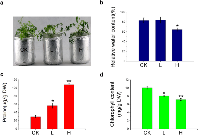 实验目的:明确太行菊对不同程度干旱胁迫的生理响应特征,筛选核心生理适应指标。方法细节:选取30天苗龄的太行菊植株,分别移栽至含0%(对照组CK)、5%(轻度胁迫组L)、25%(重度胁迫组H)PEG6000的培养基中,每个处理设置3个生物学重复,处理2天后采集新鲜叶片样本,采用烘干称重法检测叶片相对含水量(RWC)、比色法检测脯氨酸含量、乙醇-丙酮混合液提取后分光光度法检测叶绿素含量。结果解读:重度胁迫下太行菊植株出现明显萎蔫(图1a),轻度胁迫下植株形态与对照组无显著差异;相对含水量在轻度胁迫下与对照组无显著差异,重度胁迫下显著降低16.7%(n=3,P<0.01)(图1b);脯氨酸含量随胁迫程度增加显著积累,重度胁迫下含量为对照组的3.2倍(n=3,P<0.01)(图1c);叶绿素含量随胁迫程度增加略有下降,但无统计学差异(n=3,P>0.05)(图1d),表明太行菊通过积累脯氨酸维持细胞渗透压,在轻度干旱下可保持正常水分状态以适应胁迫。实验所用关键产品:OMEGA的Plant RNA Kit、Shimadzu分光光度计、Roche的LightCycler Multiplex DNA Master Kit等。