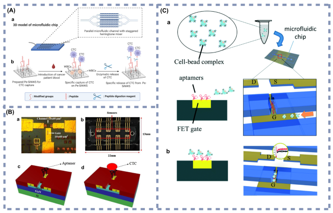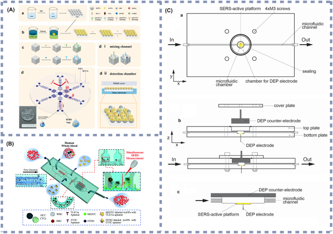 实验目的:总结近年微流控技术与不同检测方法结合的应用进展及临床潜力;方法:分类整理电化学传感、表面增强拉曼光谱、磁富集、酶联免疫吸附试验与微流控结合的典型研究实例,分析其检测性能与临床应用场景;结果解读:电化学微流控传感器方面,Prathap等开发的黑色素瘤循环肿瘤细胞检测系统,通过孔径筛选结合抗Melanocortin 1受体(MC1R)抗体修饰的电化学电极,实现了10细胞/10mL的检测限(图3A),适合黑色素瘤的早期筛查与复发监测;表面增强拉曼光谱微流控传感器方面,Gu等开发的双标志物检测系统,基于Au@SiO₂阵列基底的“热点”效应,实现了鳞状细胞癌抗原(SCCA)(0.37pg/mL)与癌胚抗原(0.28pg/mL)的超灵敏检测(图4A),适合鳞状细胞癌等多种癌症的早期诊断;磁富集微流控传感器方面,Liu等开发的乳腺癌外泌体检测系统,通过免疫磁珠捕获结合液滴微流控技术,实现了10个/μL的检测限(图5A),适合乳腺癌的早期检测与动态监测;酶联免疫吸附试验微流控传感器方面,Shen等开发的胰腺癌循环肿瘤细胞捕获系统,通过肽修饰的硅纳米线实现了95.6%的循环肿瘤细胞捕获效率与92.6%的细胞释放效率(图6A),适合胰腺癌的早期筛查与活细胞分析;产品关联:文献中提及的关键产品包括聚苯胺(PANI)纳米纤维修饰的丝网印刷电极(SPE)、免疫磁珠、核酸适配体等,未明确标注具体品牌及货号,领域常规使用Bio-Rad的丝网印刷电极、Thermo Fisher的免疫磁珠等。