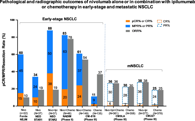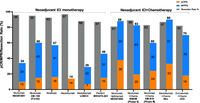 本环节的核心目标是系统总结不同类型可切除NSCLC的精准新辅助治疗疗效,方法是分类整合已获批及在研临床试验的核心数据,包括非驱动基因NSCLC的免疫联合化疗、驱动基因NSCLC的靶向治疗。结果显示,非驱动基因NSCLC中,NEOSTAR试验显示纳武利尤单抗联合伊匹木单抗的pCR率达38%,高于纳武利尤单抗单药的10%;驱动基因NSCLC中,EMERGING-CTONG 1103试验显示厄洛替尼对比化疗的主要病理缓解(MPR)率更高,但仍需III期试验验证长期获益。文献未提及具体实验产品,领域常规使用PD-1/PD-L1抑制剂(如纳武利尤单抗、帕博利珠单抗)、EGFR TKI(如奥希替尼、厄洛替尼)等治疗药物。