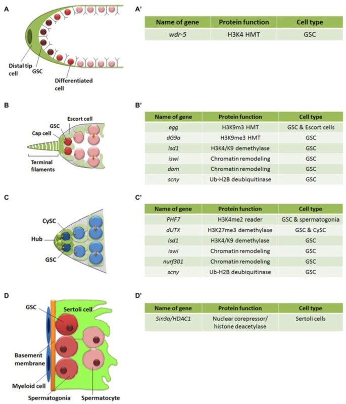 结果解读:在秀丽隐杆线虫中,ASH-2复合物(组蛋白H3K4三甲基化酶复合物)缺陷导致生殖系干细胞维持异常,WDR-5基因敲除后生殖系干细胞数量减少(文献未明确提供样本量与P值);在果蝇中,Egg酶(H3K9甲基转移酶)同时调控生殖系干细胞的自我更新与分化,敲除后出现生殖系干细胞丢失或过度积累的双向表型;在小鼠中,Sertoli细胞中Sin3a基因缺失导致生殖系干细胞完全丢失,Oct4等干细胞标志物表达下调(文献未明确提供样本量与P值)。