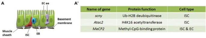 结果解读:Scrawny酶(组蛋白H2B去泛素化酶)缺陷导致肠道干细胞因Notch通路异常激活而发生分化,成虫在短时间内丢失肠道干细胞(文献未明确提供样本量与P值);Atac2(组蛋白乙酰转移酶)过表达促进肠道干细胞分化,敲除后肠道干细胞数量显著增加(文献未明确提供样本量与P值);异源表达人类MeCP2后,果蝇肠道干细胞增殖异常激活,提示DNA甲基化相关调控通路在肠道干细胞中的保守作用。