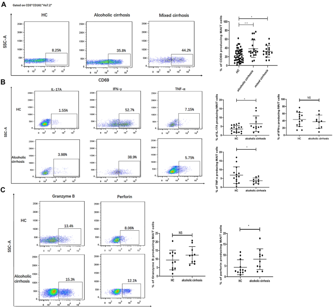 结果解读:酒精性肝硬化患者的MAIT细胞CD69表达水平显著升高,提示MAIT细胞处于激活状态;与健康对照相比,酒精性肝硬化患者MAIT细胞的IL-17A分泌水平升高(P=0.02),TNF-α分泌水平降低(P=0.033),穿孔素表达水平升高(P=0.046),而IFN-γ及颗粒酶B的表达水平无明显差异。