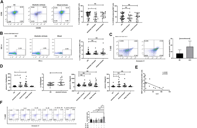 结果解读:酒精性肝硬化及混合肝硬化患者MAIT细胞的CCR6、CXCR6及PD-1表达水平与健康对照无明显差异;酒精性肝硬化患者的MAIT细胞凋亡率显著升高(P=0.034);酒精性肝硬化患者的IL-12p40、IL-12p70、IL-8水平显著高于健康对照,IL-18在所有饮酒相关组中均高表达;MAIT细胞频率与IL-8水平呈负相关;单独IL-8处理未促进MAIT细胞凋亡,但IL-12、IL-18联合IL-8可显著增强MAIT细胞的凋亡水平。
