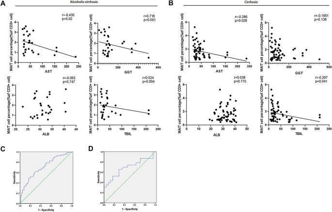 方法细节:采用Spearman相关性分析,分析酒精性肝硬化及混合肝硬化患者循环MAIT细胞频率与肝功能指标(AST、GGT、TBIL、ALB)的相关性;构建受试者工作特征(ROC)曲线,评估MAIT细胞对肝硬化及肝硬化严重程度(Child-Pugh分级)的诊断价值。