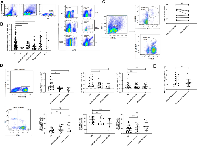 方法细节:采用流式细胞术,通过CD3+CD161+Vα7.2+的门控策略识别MAIT细胞,同时采用MR1四聚体及TCRβ染色验证门控策略的可靠性;分析MAIT细胞的CD4/CD8亚群分布,并比较戒酒与未戒酒的酒精性肝硬化患者MAIT细胞频率差异。