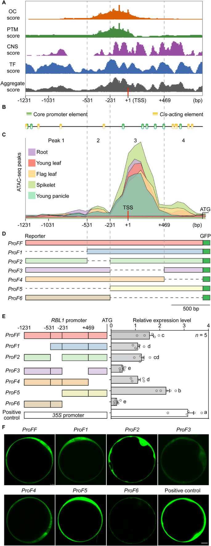 方法细节:通过5" RACE技术确定RBL1的转录起始位点(TSS),整合ATAC-seq、DNase-seq、ChIP-seq等公共数据库的染色质可及性数据,结合PlantDeepSEA、PlantCARE等生物信息学工具,分析启动子区域的开放染色质峰、转录因子结合位点、核心启动子元件和顺式作用元件,最终将RBL1的2.2kb启动子区域划分为4个峰区域。