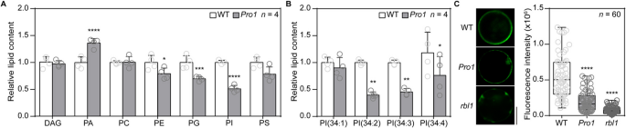 方法细节:采用脂质组学分析Pro1与野生型植株的磷脂代谢差异,通过转录组和代谢组分析基因表达和代谢通路的变化,测定活性氧(ROS)、水杨酸(SA)含量和病程相关基因(PR)的表达水平,同时利用PtdIns(4,5)P2生物传感器观察细胞膜上该磷脂的分布变化。