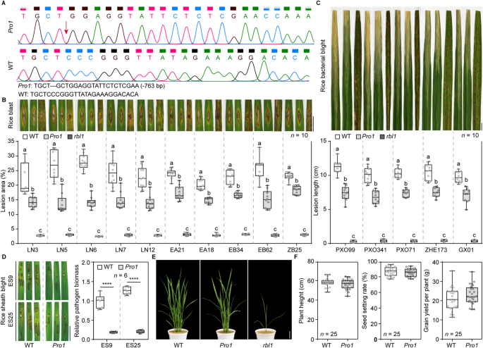 结果解读:Pro1和Pro2株系对稻瘟病的抗性显著增强,病斑面积较野生型分别减少26.7%和13.4%(n=42-58,P<0.001);对白叶枯病的病斑长度分别缩短至7.7cm和9.6cm(野生型为14.9cm,n=14-20,P<0.001);对纹枯病的病斑面积也显著小于野生型(n=6,P<0.0001)。同时,Pro1和Pro2的农艺性状与野生型无显著差异,单株产量分别为23.1g和22.5g(野生型为21.1g,n=10,P>0.05);而Pro3和Pro4株系的抗病性显著降低,农艺性状无显著变化。进一步验证显示,Pro1对10个稻瘟病菌株、5个白叶枯病菌株均具有广谱抗性。