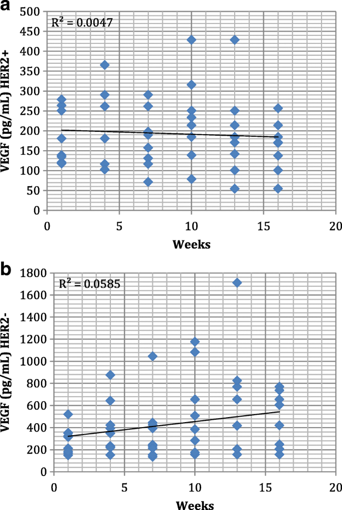 Biomarker来源为乳腺癌患者治疗过程中的血清样本;验证方法为酶联免疫吸附试验,采用R&D Systems的专用试剂盒;特异性与敏感性数据方面,文献未明确提供ROC曲线等定量数据,但基线时HER2阴性组VEGF水平高于HER2阳性组(文献未明确具体数值),HER2阳性组VEGF水平呈下降趋势,HER2阴性组呈上升趋势;MCSF在HER2阳性组保持稳定,HER2阴性组呈上升趋势。