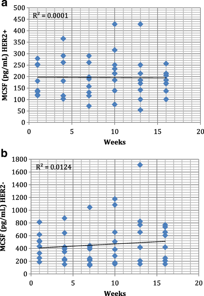 实验目的是对比不同HER2亚型患者在治疗过程中VEGF和MCSF的水平变化趋势。方法细节为对两组患者各时间点的血清因子水平进行线性回归趋势分析,绘制散点图并计算R²值。结果解读显示,HER2阳性组血清MCSF水平在治疗过程中保持稳定(范围约50pg/mL至450pg/mL),VEGF水平呈轻微下降趋势;HER2阴性组血清VEGF和MCSF水平均呈上升趋势。