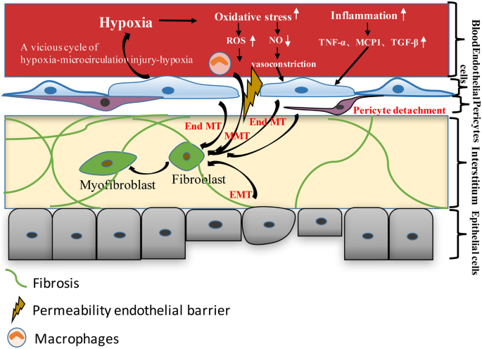 本环节核心目标是明确CKD中肾微循环损伤的核心病理环节及分子调控网络。作者系统回顾了领域内多种CKD动物模型(5/6肾切除大鼠、缺血再灌注损伤小鼠、链脲佐菌素诱导糖尿病模型、自发性高血压大鼠等)及临床样本研究,整合组织学、分子生物学、影像学等多维度数据,梳理肾微循环损伤的连锁反应机制。结果显示,肾微循环损伤始于内皮功能障碍,包括NO合成减少、血管收缩因子(血管紧张素-2、内皮素-1)激活、促/抗血管生成因子失衡,进而引发组织缺氧,诱导肾间质成纤维细胞增殖及肌成纤维细胞转化;同时,炎症因子(如IL-1、细胞间黏附分子-1 ICAM-1)招募白细胞浸润,氧化应激导致内皮细胞凋亡及内皮-间充质转化(EndMT),周细胞脱离微血管分化为肌成纤维细胞,巨噬细胞浸润后发生MMT,这些机制相互作用形成恶性循环,推动肾纤维化进展。文中Fig.1直观展示了毛细血管稀疏与CKD的关联机制,涵盖组织缺氧、炎症因子招募、活性氧(ROS)产生、巨噬细胞浸润及周细胞脱离迁移等关键环节。