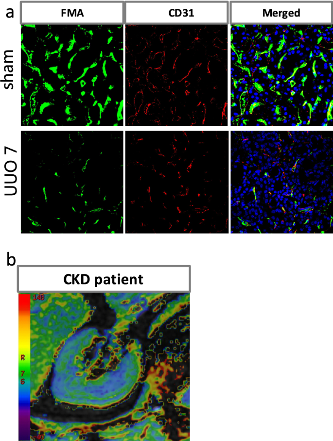 本环节核心目标是梳理可用于评估CKD肾微循环的新型技术,对比各技术的优势、局限性及临床应用潜力。作者分类总结了侵入性与非侵入性检测技术,包括同步辐射(SR)肾微血管造影、显微计算机断层扫描(μCT)、荧光微血管造影(FMA)、血氧水平依赖磁共振成像(BOLD-MRI)、电子显微镜等,详细分析各技术的成像原理、空间分辨率、操作流程及适用场景。结果显示,SR可实现肾单位结构的高分辨率成像,最小观察动脉直径达18μm,但为二维投影无法反映肾脏三维结构;μCT可清晰显示血管分支、大小及迂曲度,实现相对血容量的精确定量,但存在X射线暴露及需碘造影剂的限制;FMA可通过肾动脉注射荧光聚苯乙烯微球,三维重建肾微循环,识别肾小球及管周毛细血管(PTC)密度降低,避免内皮抗原与淋巴管共表达的干扰,但需侵入性操作;BOLD-MRI基于脱氧血红蛋白的顺磁性,通过测量R2值评估组织缺氧程度,是唯一非侵入性评估组织氧代谢的方法,可自动生成伪彩图(蓝色代表高肾组织氧合,绿、黄、红色代表显著缺氧),无需外源性造影剂,适合临床长期监测;电子显微镜可观察内皮细胞超微结构变化,如窗孔数量减少、内皮下间隙增宽、内皮空泡及小凹数量增加,但存在采样误差,仅能反映局部组织变化。文中Fig.2a展示了FMA在单侧输尿管梗阻(UUO)模型中检测到的PTC密度降低,Fig.2b展示了CKD患者BOLD-MRI的R2图像,显示皮质及髓质氧合水平显著降低。