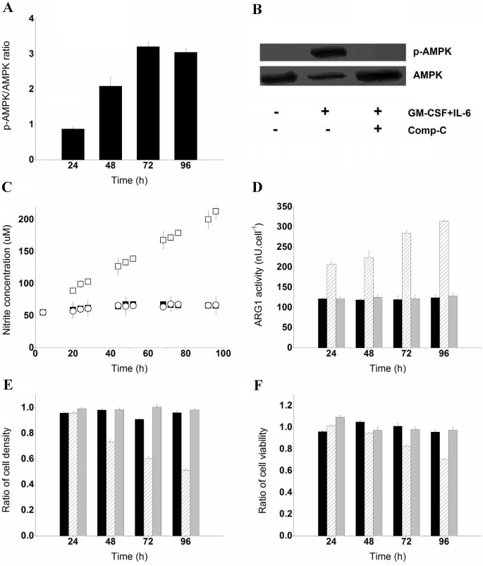 方法细节:采用蛋白质免疫印迹(Western blot)检测MDSCs中磷酸化AMPK(p-AMPK)的表达水平;用5μM的AMPK特异性抑制剂Compound C(Comp-C)预处理骨髓细胞15min,然后用GM-CSF和IL-6诱导MDSCs,检测细胞的葡萄糖摄取率、iNOS/ARG1活性,以及共培养后Jurkat细胞的密度与活力。