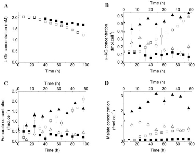 方法细节:采用生物化学分析仪检测细胞培养上清中葡萄糖、L-谷氨酰胺(L-Gln)的浓度变化,计算细胞的营养摄取率;通过超高效液相色谱-串联质谱(UPLC-MS/MS)检测细胞内糖酵解中间产物(葡萄糖-6-磷酸G-6-P、果糖-6-磷酸F-6-P)、三羧酸循环(TCA)中间产物(α-酮戊二酸α-KG、延胡索酸、苹果酸)的浓度。