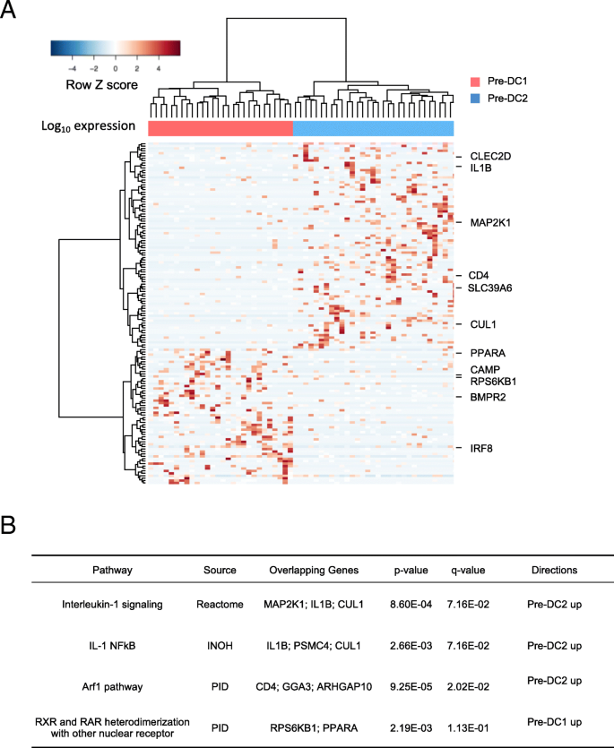 结果解读:在三个独立数据集中,候选主调控转录因子均可有效区分前经典树突状细胞的两个预承诺亚群,且IRF8/IRF4比值与亚群的关联一致;pre-cDC1与pre-cDC2的差异表达基因通路分析显示,pre-cDC1富集于RXR/RAR信号通路,该通路可促进树突状细胞的抗原呈递和分化,pre-cDC2富集于IL-1相关通路,与经典树突状细胞2的功能特征一致;这些结果证实了转录因子组合剂量调控前经典树突状细胞命运的结论的可靠性。