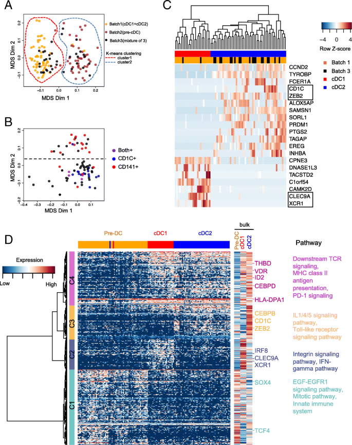 结果解读:通过测序深度过滤(>100,000比对reads)、线粒体比例过滤(<30%)和表达基因数过滤(>1000),最终获得135个高质量单细胞转录组数据;多维尺度分析显示,不同批次的细胞可被清晰分为前经典树突状细胞集群和经典树突状细胞集群,且经典树突状细胞集群可进一步分为经典树突状细胞1和经典树突状细胞2亚群,与细胞表面标记的表达完全一致,表明单细胞转录组可独立于表面标记区分细胞类型,且批次效应可忽略。