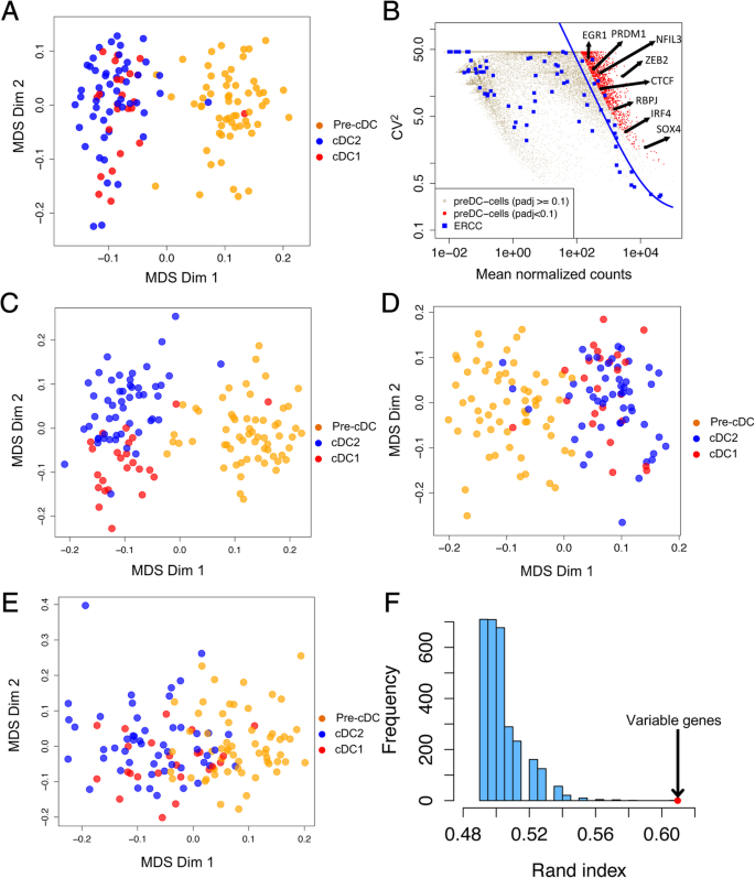 方法细节:采用Brennecke等的方法,基于ERCC spike-in估计技术噪声,筛选前经典树突状细胞中表达变异性显著高于技术噪声的基因(FDR<0.1,至少在30个单细胞中检测到表达),共得到842个高可变基因;通过多维尺度分析这些基因对细胞分群的影响,并与随机基因、细胞周期基因的分群效果对比。