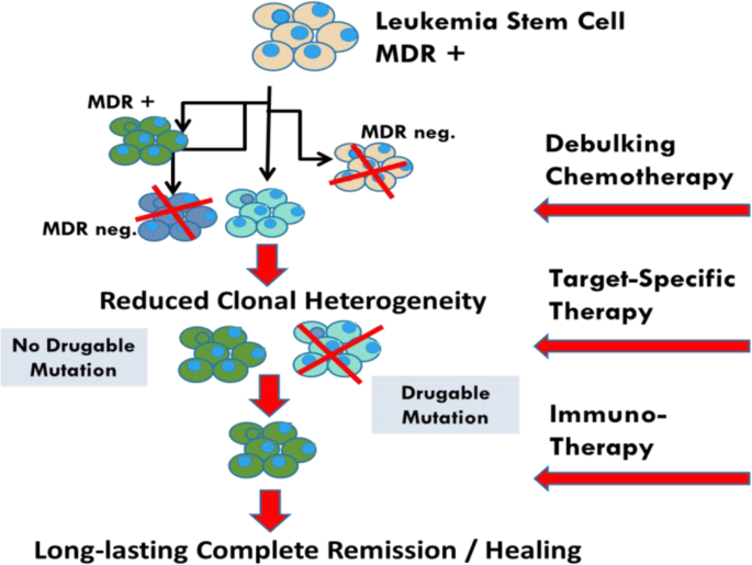 图4提出了针对LSC泛耐药亚克隆的联合治疗策略;产品关联:文献未提及具体实验产品,领域常规使用高灵敏度MRD检测试剂、多参数流式细胞术panel。