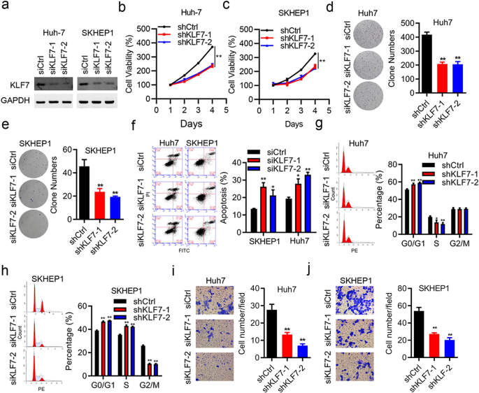 本环节的实验目的是验证KLF7对肝细胞癌细胞增殖、侵袭、细胞周期及凋亡的调控作用,以及其在体内的成瘤能力。方法细节上,在Huh-7和SKHEP1肝细胞癌细胞系中,采用siRNA技术敲低KLF7的表达,或通过pcDNA3.1质粒过表达KLF7;分别采用CCK-8实验检测细胞增殖能力,克隆形成实验检测细胞克隆形成能力,Transwell实验检测细胞侵袭能力,流式细胞术检测细胞周期分布及凋亡率;同时构建裸鼠皮下移植瘤模型,将稳定敲低或过表达KLF7的MHCC97H细胞分别注射到裸鼠右侧颈部,每3天测量肿瘤大小,30天后处死小鼠并计算肿瘤体积和重量。结果解读显示,敲低KLF7后,Huh-7和SKHEP1细胞的增殖能力显著降低(n=3,P<0.01),克隆形成率显著下降(n=3,P<0.01),细胞侵袭能力显著减弱(n=3,P<0.01),G0/G1期细胞比例显著增加,凋亡率显著升高(n=3,P<0.05);过表达KLF7则显著促进肝细胞癌细胞的增殖、侵袭能力,加速细胞周期进程,抑制细胞凋亡(n=3,P<0.01);体内实验结果显示,KLF7敲低组的肿瘤体积和重量显著小于对照组(n=5,P<0.01),KLF7过表达组的肿瘤体积和重量显著大于对照组(n=5,P<0.001),与体外实验结果一致。实验所用关键产品:FITC Annexin V凋亡检测试剂盒(BD Biosciences)、Transwell小室(Corning lnc., USA);CCK-8试剂盒未明确品牌,领域常规使用Dojindo CCK-8试剂盒。