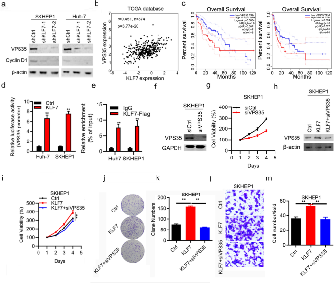 本环节的实验目的是明确KLF7是否通过转录激活VPS35的表达来发挥促癌作用。方法细节上,采用蛋白质免疫印迹(Western blot)检测KLF7敲低或过表达后VPS35的蛋白表达水平;通过TCGA数据库分析KLF7与VPS35在肝细胞癌组织中的表达相关性;采用双荧光素酶报告基因实验,将VPS35的启动子序列克隆到荧光素酶报告载体中,与KLF7过表达载体共转染肝细胞癌细胞,检测荧光素酶活性;采用染色质免疫沉淀-定量PCR(ChIP-qPCR)实验验证KLF7与VPS35启动子的结合;通过rescue实验,在KLF7过表达的细胞中敲低VPS35,检测细胞增殖和侵袭能力的变化。结果解读显示,KLF7敲低后VPS35的蛋白表达水平显著降低,过表达KLF7则显著升高VPS35的蛋白表达;TCGA数据库分析显示,KLF7与VPS35在肝细胞癌组织中的表达呈显著正相关;双荧光素酶报告基因实验显示,KLF7过表达显著增强VPS35启动子的荧光素酶活性(n=3,P<0.01);ChIP-qPCR实验证实KLF7可直接结合VPS35的启动子区域;rescue实验显示,敲低VPS35可显著逆转KLF7过表达对肝细胞癌细胞增殖和侵袭的促进作用(n=3,P<0.01)。实验所用关键产品:抗VPS35抗体(货号157220,Abcam)、双荧光素酶报告基因检测系统(Promega, USA)、SimpleChIP酶促染色质IP试剂盒(Cell Signaling)。