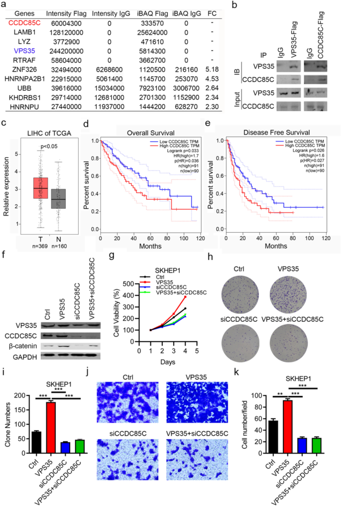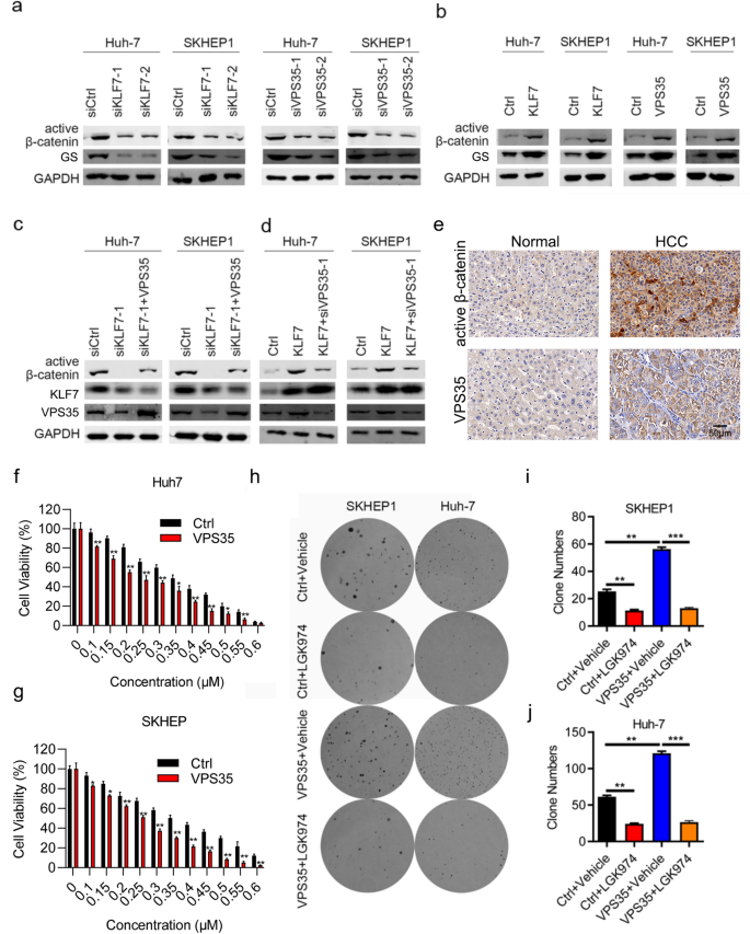 本环节的实验目的是探究VPS35下游的互作分子及KLF7/VPS35轴调控的下游信号通路。方法细节上,采用免疫共沉淀(Co-IP)实验结合质谱分析筛选VPS35的互作分子,并通过Western blot验证VPS35与CCDC85C的相互作用;通过TCGA数据库分析CCDC85C在肝细胞癌组织中的表达及与患者生存的相关性;通过rescue实验,在VPS35过表达的细胞中敲低CCDC85C,检测细胞增殖、侵袭及凋亡能力的变化;采用Western blot检测KLF7/VPS35轴对β-连环蛋白通路的影响,并使用β-连环蛋白抑制剂GK974处理细胞,验证通路功能。结果解读显示,Co-IP实验结合质谱分析证实VPS35与CCDC85C在肝细胞癌细胞中存在相互作用;TCGA数据库分析显示,CCDC85C在肝细胞癌组织中高表达,与患者总生存不良(P=0.036)及无病生存不良(P<0.027)显著相关;rescue实验显示,敲低CCDC85C可显著逆转VPS35过表达对肝细胞癌细胞增殖和侵袭的促进作用(n=3,P<0.01);Western blot结果显示,KLF7/VPS35轴可显著上调活性β-连环蛋白的表达,β-连环蛋白抑制剂GK974可显著阻断VPS35过表达对肝细胞癌细胞增殖的促进作用(n=3,P<0.001);免疫组化染色显示,肝细胞癌组织中VPS35与活性β-连环蛋白的表达呈显著正相关(n=50,P<0.05)。实验所用关键产品:抗CCDC85C抗体(货号TA330857,ORIGENE)、抗活性β-连环蛋白抗体(货号19807,Cell Signaling Technology);β-连环蛋白抑制剂GK974未明确品牌,领域常规使用Selleck GK974。