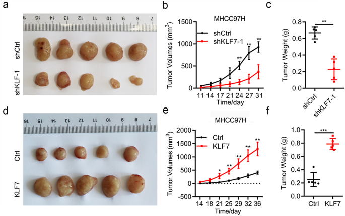 本环节的实验目的是明确KLF7在肝细胞癌患者临床样本中的表达水平,及其与患者临床病理特征的相关性。方法细节上,研究团队收集了20对肝细胞癌及癌旁正常组织样本,采用实时荧光定量PCR(qRT-PCR)检测KLF7的mRNA表达水平;同时使用包含50例肝细胞癌组织和20例正常肝组织的组织芯片进行免疫组化(IHC)染色,检测KLF7的蛋白表达;此外从TCGA数据库中提取肝细胞癌患者的基因表达及生存数据,分析KLF7表达与患者生存的相关性。结果解读显示,qRT-PCR结果表明肝细胞癌组织中KLF7的mRNA表达水平显著高于癌旁正常组织(n=20,P=0.001);有转移的肝细胞癌组织中KLF7表达水平显著高于无转移组(n=20,P=0.0072),低分化肝细胞癌组织中KLF7表达水平显著高于高分化组(n=20,P=0.0259);免疫组化染色结果显示,肝细胞癌组织中KLF7呈强阳性表达,而正常肝组织中表达水平较低;但TCGA数据库分析显示,KLF7高表达与肝细胞癌患者的总生存无显著相关性(n=90,P=0.28)。实验所用关键产品:抗KLF7抗体(货号398576,Santa Cruz);qRT-PCR试剂、免疫组化染色试剂未明确品牌,领域常规使用Takara qRT-PCR试剂盒、Dako免疫组化试剂盒等。