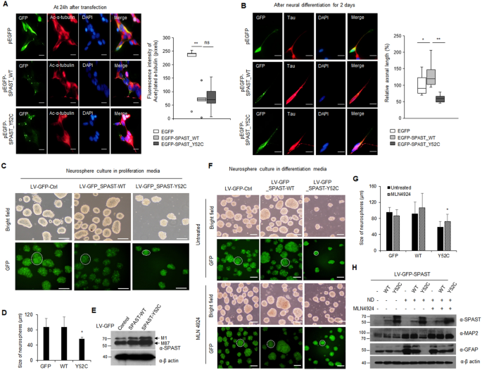 实验目的是解析spastin Y52C突变体的致病机制及MLN4924的治疗效果。方法细节为构建spastin Y52C突变体,通过Co-IP验证其与FBXL17的互作;在ReNcell CX细胞中过表达Y52C突变体,通过免疫荧光检测轴突生长、3D神经球实验检测增殖和分化能力;使用MLN4924处理突变体过表达的细胞,检测表型恢复情况。结果解读显示,Y52C突变体因BTB结构域破坏无法与FBXL17互作,逃避泛素化降解,蛋白积累但功能丧失;过表达Y52C突变体导致轴突长度缩短约35%(n=3,P<0.01),3D神经球直径减小约40%(n=3,P<0.01),分化能力下降;MLN4924处理可恢复突变体的轴突生长和分化能力。实验所用关键产品:3D细胞培养板(Corning)、Tau抗体(Cell Signaling Technology)。