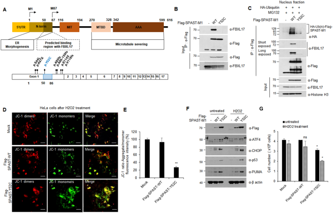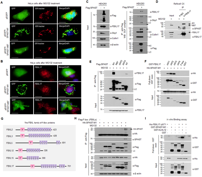 实验目的是明确spastin-M1与FBXL17互作的具体结构域。方法细节为构建spastin-M1的N端截短突变体和FBXL17的截短突变体,通过Co-IP、GST pull-down和体外结合实验验证互作结构域;同时检测spastin-M1和FBXL17的亚细胞定位。结果解读显示,spastin-M1通过N端的BTB结构域(50-86 aa)与FBXL17的亮氨酸重复序列(LRR)结构域(471-571 aa)互作,spastin-M87因缺乏BTB结构域无法与FBXL17互作;spastin-M1定位于内质网和细胞核,FBXL17主要定位于细胞核,二者在细胞核中共定位。实验所用关键产品:CRISPR/Cas9质粒(Santa Cruz)、免疫荧光显微镜(IX71,Olympus)。