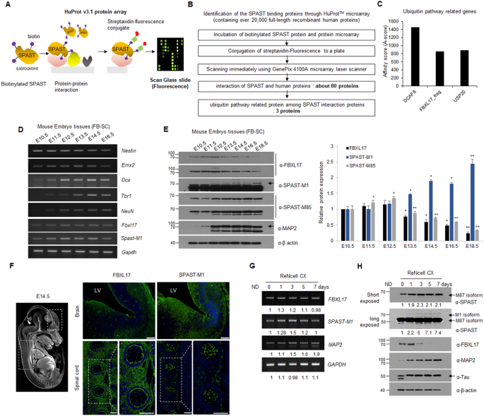 实验目的是筛选并验证调控spastin-M1的E3泛素连接酶。方法细节为使用包含20000余种人类重组蛋白的HuProt™蛋白芯片,以生物素化的His-spastin-M1为诱饵筛选互作蛋白,通过免疫共沉淀(Co-IP)和免疫印迹(WB)验证互作;同时检测小鼠胚胎脑和脊髓组织、ReNcell CX神经分化过程中spastin-M1与FBXL17的表达相关性。结果解读显示,蛋白芯片筛选出FBXL17等4个泛素通路相关蛋白,Co-IP验证spastin-M1仅与FBXL17直接互作;在小鼠胚胎发育阶段(E10.5-E18.5)和ReNcell CX神经分化过程中,spastin-M1蛋白表达与FBXL17呈负相关(n=3,P<0.05)。实验所用关键产品:HuProt™蛋白芯片(CDI Labs)、GenePix4100A微阵列激光扫描仪(Molecular Devices)。