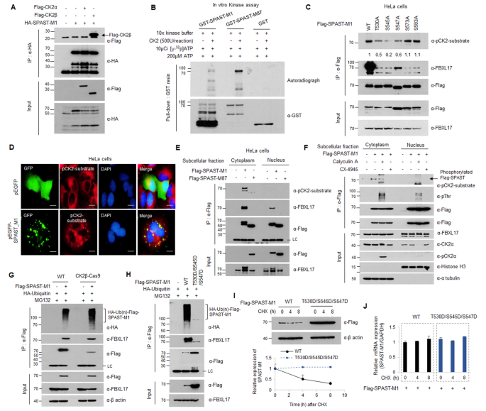 实验目的是解析磷酸化与泛素化在spastin-M1调控中的 Crosstalk。方法细节为通过Co-IP验证spastin-M1与CK2的互作,体外激酶实验检测CK2对spastin-M1的磷酸化;构建spastin-M1的磷酸化位点突变体,通过WB和泛素化实验检测磷酸化对泛素化的影响;使用CK2抑制剂CX4945和磷酸酶抑制剂calyculin A验证磷酸化的调控作用。结果解读显示,spastin-M1与CK2β互作,CK2可在细胞质中磷酸化spastin-M1的T530、S545和S547位点;磷酸化的spastin-M1可逃避SCF^{FBXL17}复合物的泛素化降解,蛋白稳定性显著提高(n=3,P<0.01)。实验所用关键产品:CK2激酶(New England Biolabs)、CX4945(Sigma-Aldrich)。