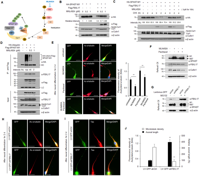 实验目的是验证抑制FBXL17对spastin-M1蛋白水平和轴突生长的影响。方法细节为使用MLN4924(Neddylation抑制剂,抑制SCF复合物活性)处理HEK293T和ReNcell CX细胞,通过WB检测spastin-M1的蛋白水平;使用紫杉醇构建轴突损伤模型,通过免疫荧光检测轴突长度;构建FBXL17的shRNA慢病毒,敲低ReNcell CX细胞中的FBXL17,检测轴突生长情况。结果解读显示,MLN4924处理可剂量依赖性提高spastin-M1蛋白水平(n=3,P<0.01),并恢复紫杉醇诱导的轴突缩短和肿胀;FBXL17敲低可显著提高spastin-M1蛋白水平,促进轴突延伸(轴突长度增加约2.1倍,n=3,P<0.01)。实验所用关键产品:MLN4924(Selleck)、慢病毒载体(OriGene)。
