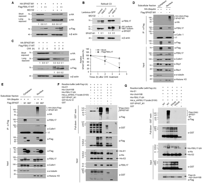实验目的是验证SCF^{FBXL17}复合物对spastin-M1的泛素化降解作用及亚细胞定位特异性。方法细节为在HEK293T和ReNcell CX细胞中过表达或敲低FBXL17,通过WB检测spastin-M1的蛋白水平;使用环己酰亚胺(CHX)检测spastin-M1的蛋白稳定性;分离细胞核和细胞质组分,通过体内泛素化实验检测spastin-M1的泛素化水平。结果解读显示,FBXL17剂量依赖性下调spastin-M1蛋白水平(n=3,P<0.01),MG132处理可抑制该降解,且不影响spastin-M1的mRNA水平;spastin-M1的半衰期在FBXL17过表达时从>4h缩短至约3h;spastin-M1的多聚泛素化仅发生在细胞核组分中,K554是主要的泛素化位点。实验所用关键产品:NE-PER核质分离试剂盒(Thermo Fisher Scientific)、MG132(Sigma-Aldrich)。