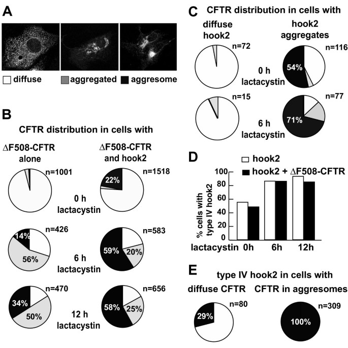 方法细节:在Vero细胞中分别单独转染ΔF508-CFTR、共转染ΔF508-CFTR与Hook2,在无lactacystin处理或处理6、12小时后,通过免疫荧光染色统计CFTR的亚细胞分布类型(弥散、聚集、聚集体),并进一步分析中心体定位Hook2细胞与弥散Hook2细胞中CFTR聚集体的比例差异。