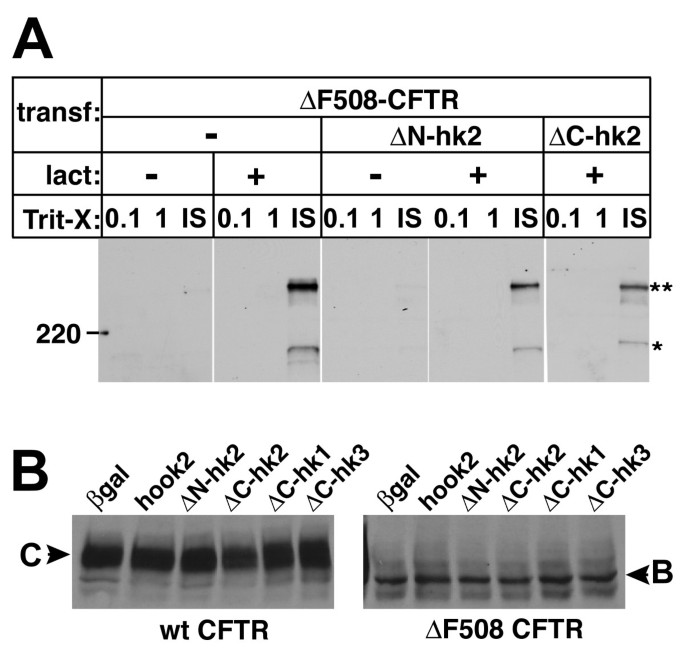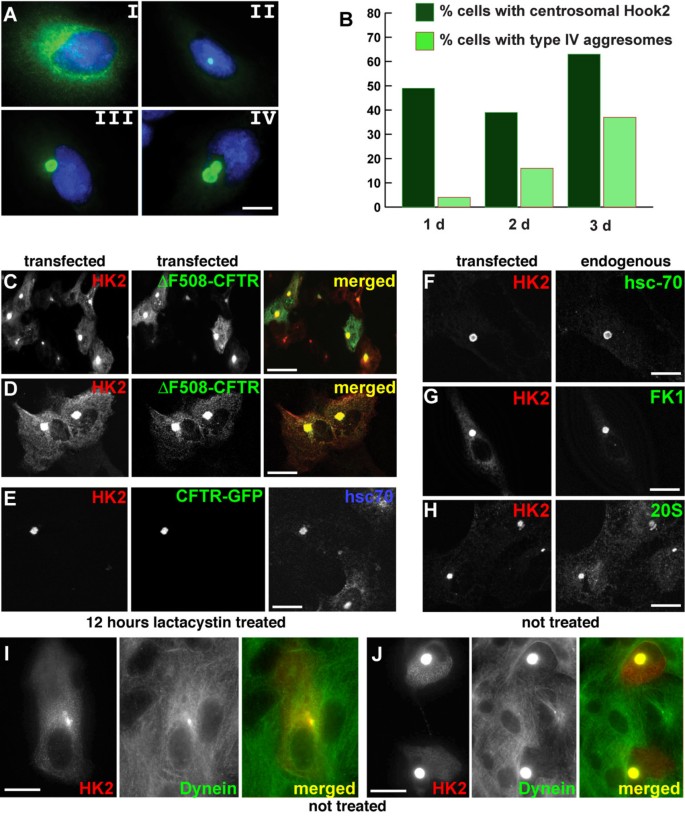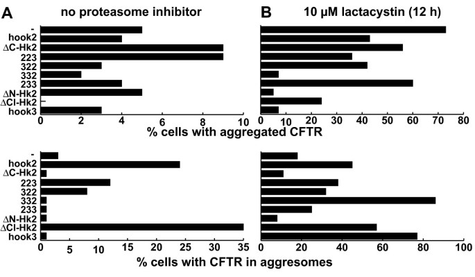 结果解读:无lactacystin处理时,ΔC-hook2使CFTR聚集体的细胞比例从3%降至1%(文献未明确样本量,基于图表趋势推测),并增加聚集态CFTR的比例;在lactacystin处理下,野生型Hook2使聚集体比例翻倍,而ΔC-hook2与ΔN-hook2均显著降低聚集体比例,Hook3过表达无抑制作用,说明Hook2的功能对聚集体形成是必需的,且作用具有特异性,依赖于其完整的结构域。