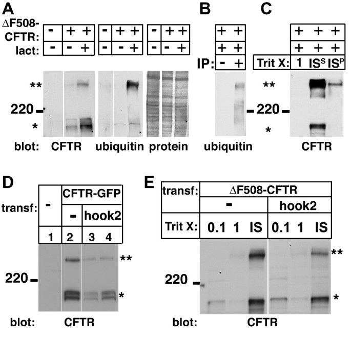 方法细节:采用免疫印迹技术检测Hook2过表达或显性负突变细胞中CFTR的电泳迁移率、在不同去污剂(Triton X-100、SDS)中的溶解度、泛素化修饰水平,以及稳态蛋白表达量;同时通过免疫沉淀验证CFTR的泛素化状态。