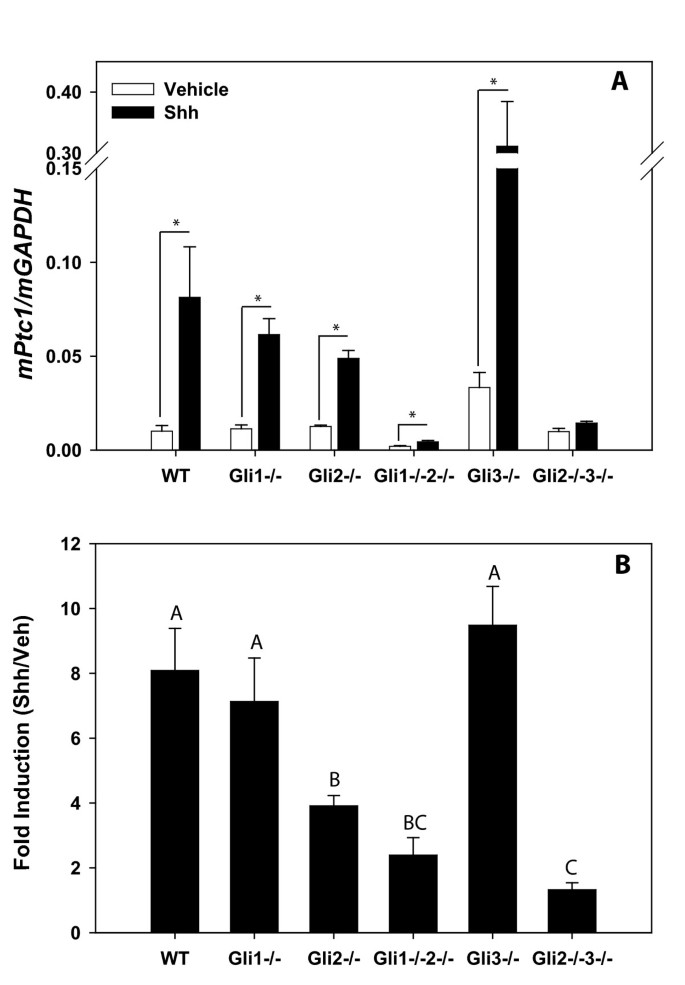 实验目的是明确不同Gli基因缺失对Hh通路转录激活的调控作用。研究将永生化细胞接种于24孔板,贴壁后用含1 nM辛酰化Shh肽(Curis/Genentech)的培养基处理24小时,通过实时荧光定量PCR检测Hh通路经典靶基因Ptc1的表达水平。结果显示,Gli3-/-细胞的基础Ptc1表达及Shh诱导后的Ptc1表达均显著高于WT细胞(基础表达P=0.03,诱导后P=0.02,n=3-5);Gli2-/-与Gli1-/-2-/-细胞的Ptc1诱导表达水平较WT显著降低;而Gli2-/-3-/-细胞完全丧失对Shh配体的转录响应能力,证实Gli2与Gli3是Hh通路转录激活的必需因子。