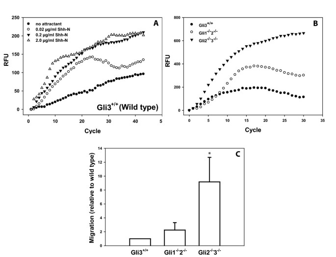 实验目的是验证Hh通路非转录响应的Gli因子依赖特性。研究采用Transwell迁移实验,将CellTracker Green(Invitrogen)标记的细胞接种于上室,下室加入不同浓度Shh肽作为趋化因子,通过CytoFluor酶标仪实时检测细胞迁移后的荧光信号。结果显示,WT、Gli1-/-2-/-、Gli2-/-3-/-细胞均对Shh肽呈现剂量依赖性迁移响应,且Gli1-/-2-/-与Gli2-/-3-/-细胞的迁移能力显著高于WT细胞(n=5,P<0.05);进一步用Smo激动剂purmorphamine、抑制剂环巴胺处理证实,该迁移响应依赖Smo蛋白,且通过白三烯合成抑制剂MK-886处理发现,迁移响应依赖白三烯合成,而不依赖新蛋白合成(环己酰亚胺处理无影响),证实Hh通路的非转录迁移响应不依赖Gli转录因子的激活。